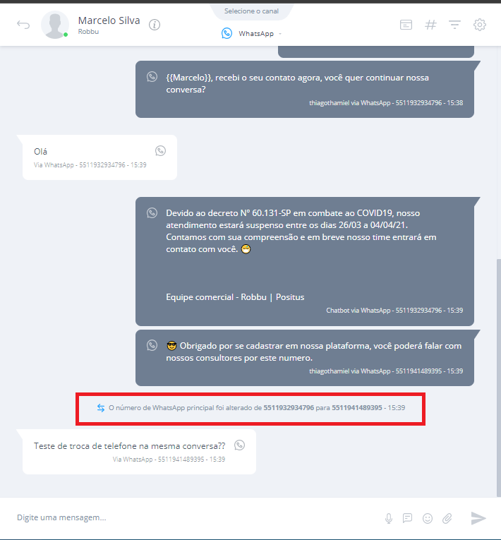 Durante uma conversa com um contato, eventualmente, este mesmo contato pode enviar mensagens por mais de um número. Quando isso acontecer, o sistema lançará automaticamente uma notificação na timeline, alertando o usuário atendente que o número principal foi trocado.