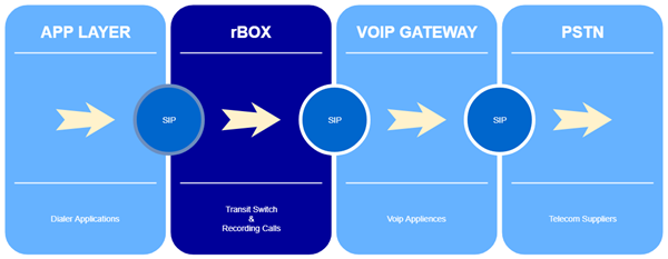 O Rbox® possui arquitetura simples e atua como transit swich e gravador de voz em ambientes de telefonia de alta complexidade com baixo e médio tráfego. A seguir, temos um exemplo de integração mais comum.