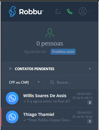 O método de distribuição preditiva não disponibiliza o botão “Próximo atendimento”, fazendo com o que os contatos sejam distribuídos para os usuários logados seguindo um dos três algoritmos pré-definidos pelo administrador do sistema.