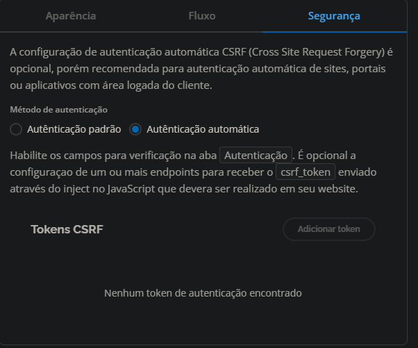 A configuração de autenticação automática CSRF (Cross Site Request Forgery) é opcional, porém recomendada para autenticação automática de sites, portais ou aplicativos com área logada do cliente.