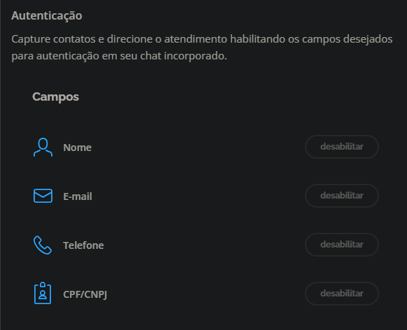 Capture contatos e direcione o atendimento habilitando os campos desejados para autenticação em seu chat incorporado.