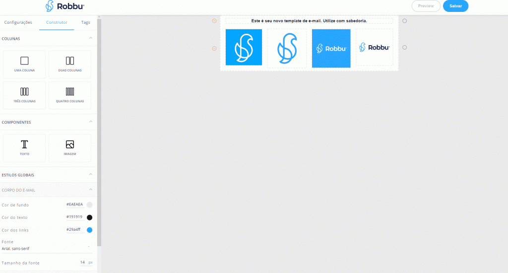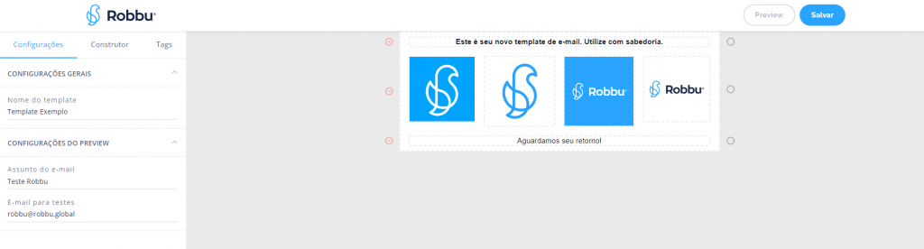 Ao criar um novo template, utilize as ferramentas disposta no ‘Construtor’ para elaborar seu modelo: