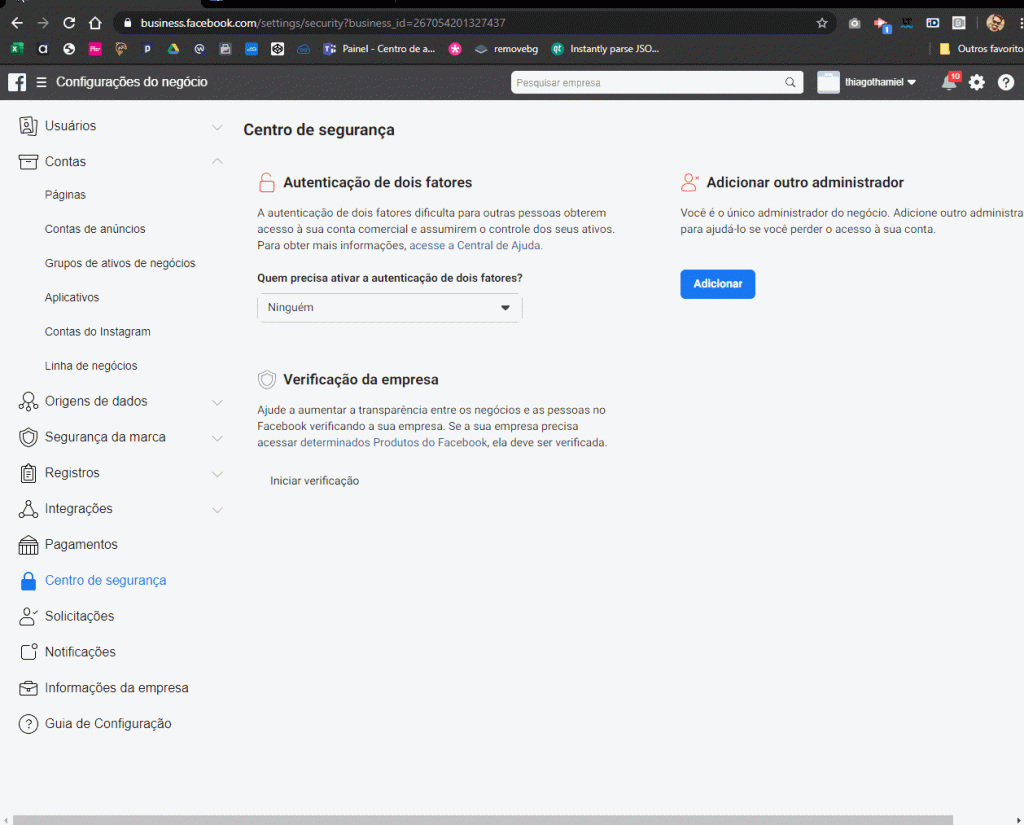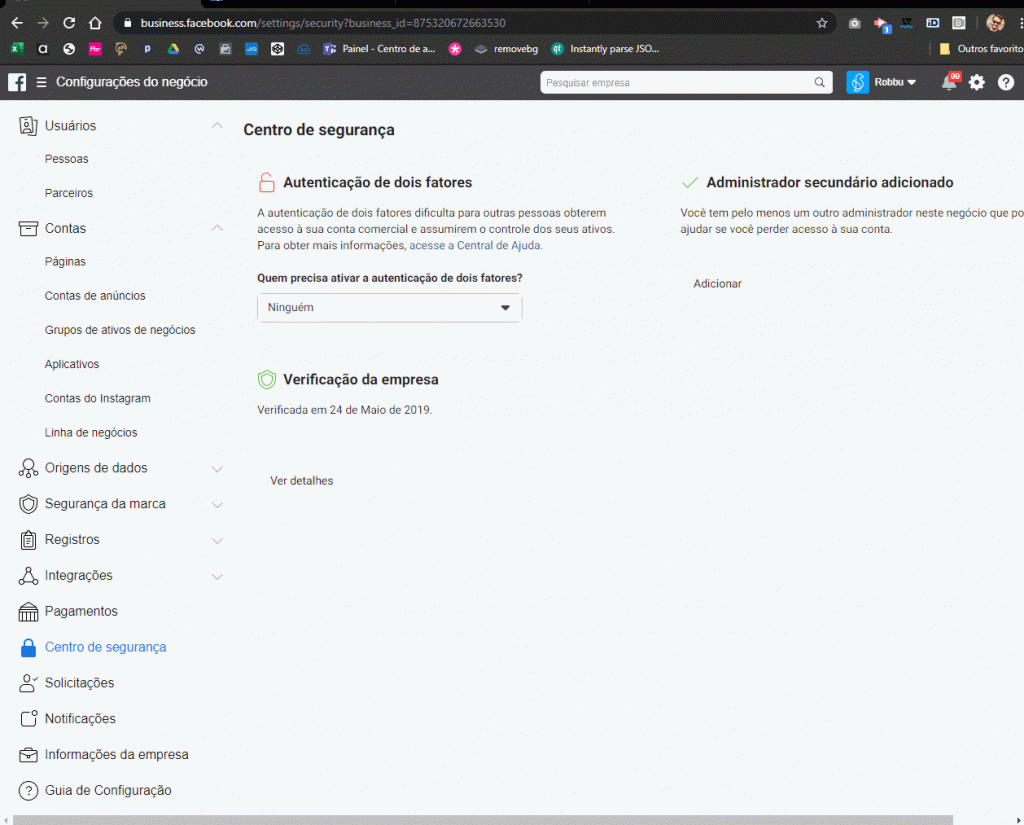 - Navegue no menu superior e clique em “Configurações de negócio” e depois clique em “Centro de segurança”.