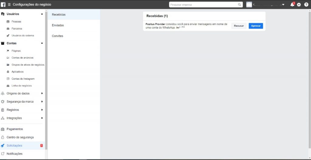 Após enviar suas informações para a Positus, nós realizaremos o cadastramento da sua empresa como parceira de negócios. Neste momento você receberá uma notificação em sua página do Business Facebook e, somente após o seu aceite, poderemos seguir com o processo de ativação do seu número. Navegue em https://business.facebook.com/ >> “Configuração do negócio” >> “Solicitações” e clique em “Aprovar”.