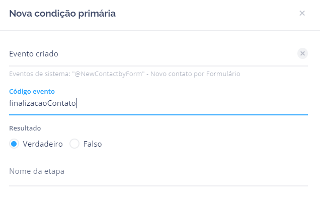 Digamos que você queira que sua pesquisa de satisfação seja iniciada imediatamente após o lançamento manual de um evento que indique a conclusão do contato. Para isto, adicione em sua IDR Outbound uma nova condição primária ‘Evento Criado’ definindo o código do evento a ser utilizado como parâmetro:
