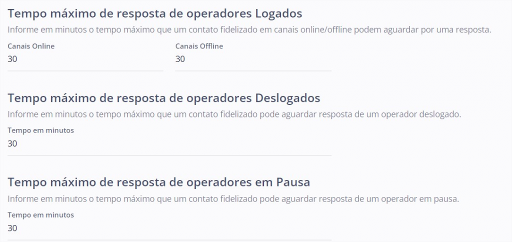 Tempo máximo de resposta de operadores Logados: Informe em minutos o tempo máximo que um contato fidelizado em canais online/offline pode aguardar por uma resposta.
