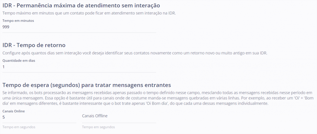 IDR – Permanência máxima de atendimento sem interação:Tempo máximo em minutos que um contato pode ficar em atendimento sem interação na IDR. (Verificar os tempos máximos também nos segmentos do ambiente, pois o menor tempo prevalecerá com a regra)