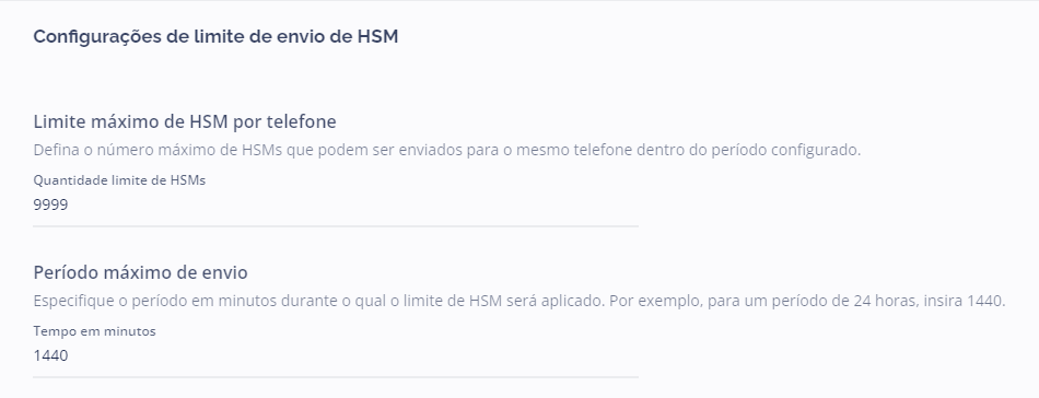 Limite máximo de HSM por telefone: Defina o número máximo de HSM’s que podem ser enviados para o mesmo telefone dentro do período configurado.Período máximo de envio: Especifique o período em minutos durante o qual o limite de HSM será aplicado. Por exemplo, para um período de 24 horas, insira 1440.