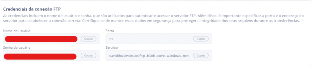 Ao habilitar a transferência de arquivos, você receberá o nome de usuário, senha, porta e servidor correspondentes para estabelecer uma conexão FTP e facilitar a transferência de arquivos: