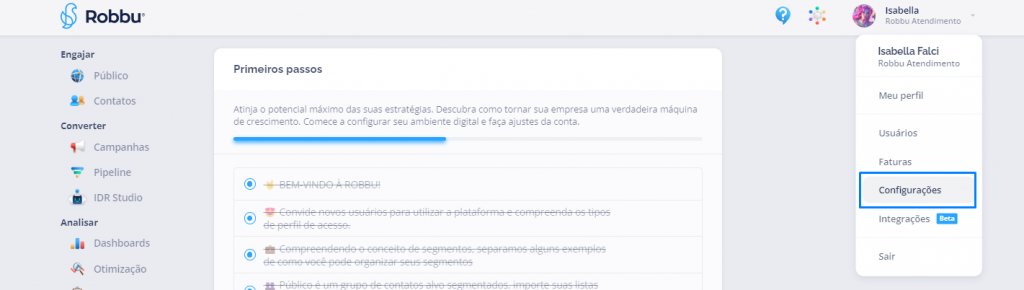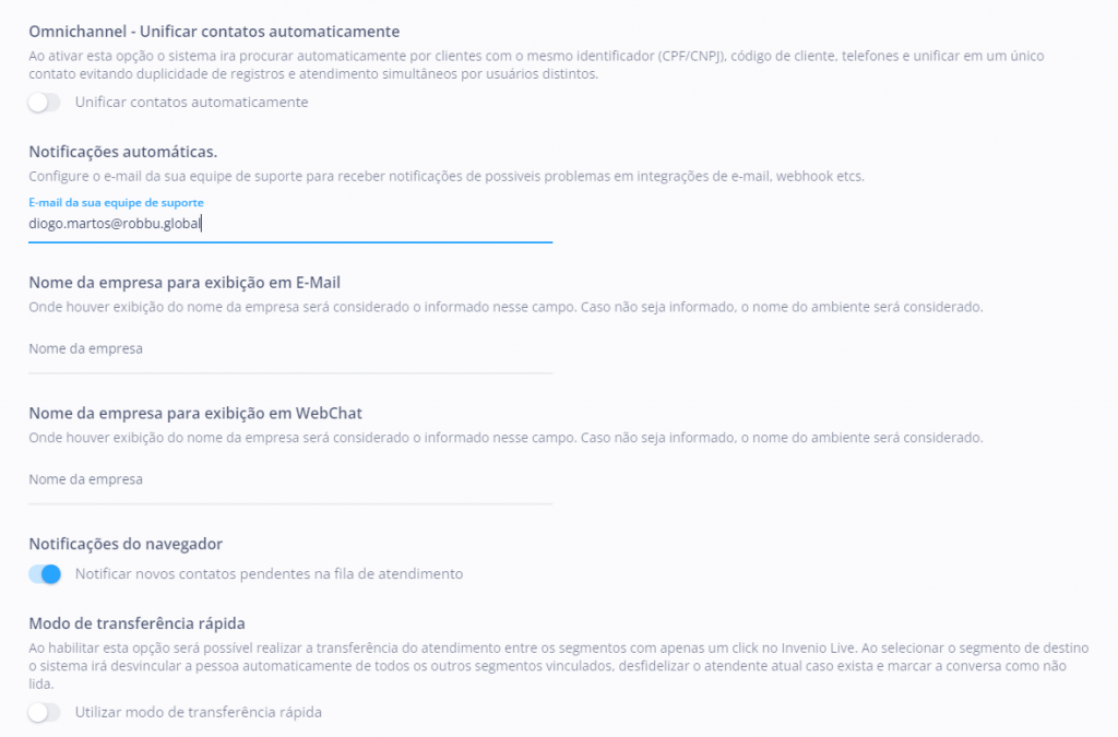 Notificações automáticas: Para receber avisos de possíveis problemas em integração de e-mail, webhook etc. Configure o e-mail da sua equipe responsável para ficar sempre por dentro.