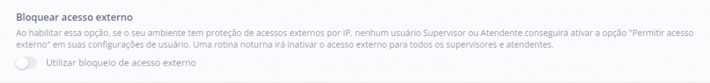 Bloquear acesso externo: Ao habilitar essa opção, se o seu ambiente tem proteção de acessos externos por IP, nenhum usuário Supervisor ou Atendente conseguirá ativar a opção “Permitir acesso externo” em suas configurações de usuário. Uma rotina noturna irá inativar o acesso externo para todos os supervisores e atendentes.