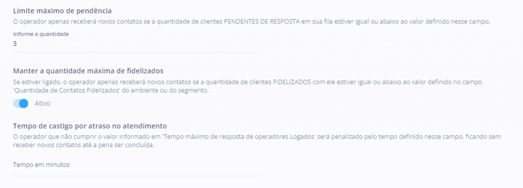 Tempo de castigo por atraso no atendimento: Caso essa configuração esteja habilitada, o sistema irá penalizar o operador que não respeitar o tempo configurado, ou seja, se não enviar uma mensagem de resposta ao contato dentro do período estipulado, receberá uma punição e ficará sem receber novos contatos até que o tempo de penalidade seja concluído.
