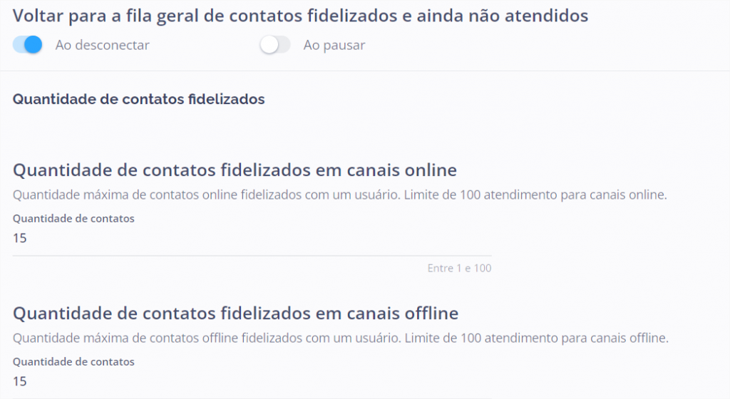 Quantidade de contatos fidelizados em canais offline: Quantidade máxima de contatos offline fidelizados com um usuário. Limite de 100 atendimento para canais offline. (Sms, Email)