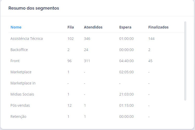 | Nome | Descrição do segmento – “Sem segmento”: É um agrupamento visual de nível sistêmico para apresentar a quantidade de contatos que não estão vinculados a nenhum segmento. |