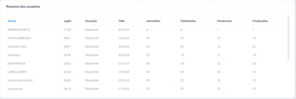 | Situação | A situação será exibida com base no momento atual do usuário, sendo elas: “Disponível”, “Deslogado” ou “Em Pausa”. |