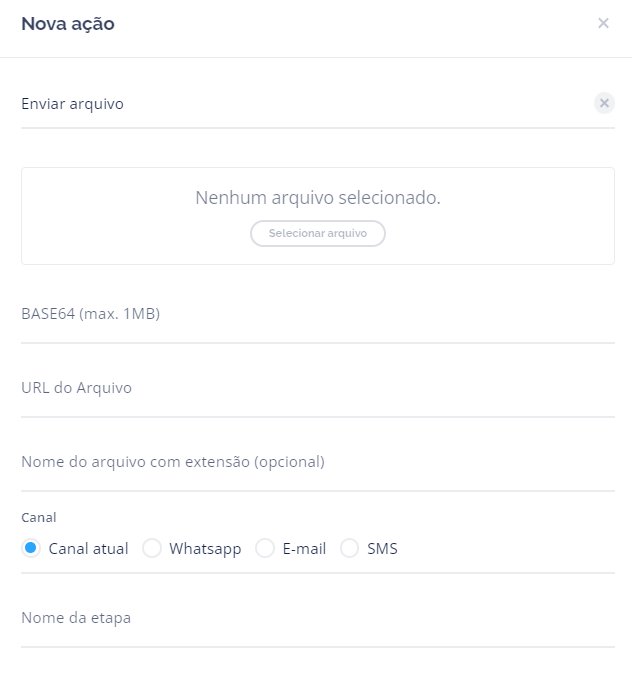 Esta ação também permite enviar arquivos via uma URL específica ou em Base64 (principalmente utilizada para envio de boletos).