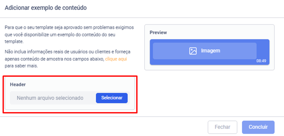 IMPORTANTE: Templates aprovados com header ativo apenas podem ser utilizados em campanha, não funcionando corretamente para disparos individuais.
