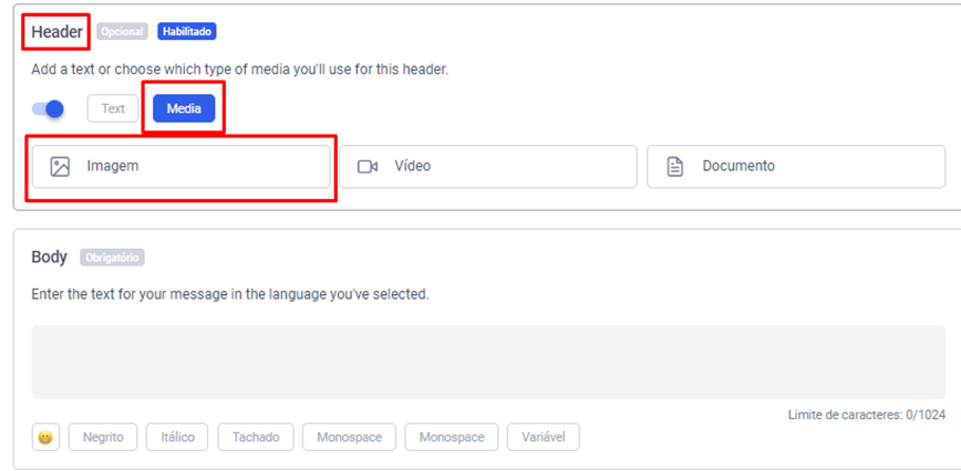 Uma vez na parte de criação de templates na Positus, basta selecionar a opção ‘Header’ e marcar qual tipo de mídia será utilizada na mensagem.