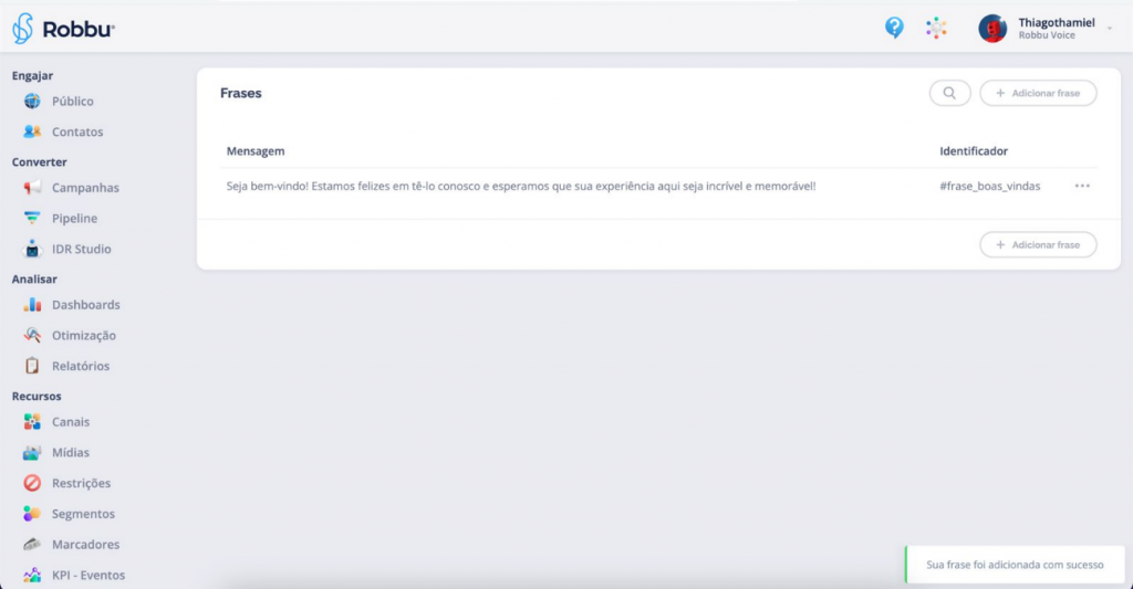 Clique em Adicionar Frase e preencha as seguintes informações: