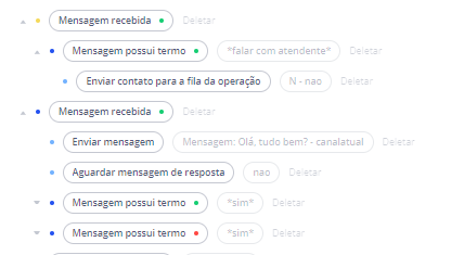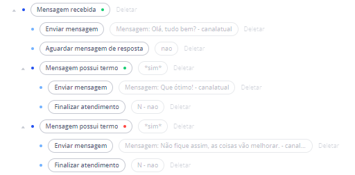 No exemplo acima, é possível compreender na prática este conceito. Cada condição possui ações dentro dela, dando continuidade ao fluxo até que ele seja finalizado ou transferido para a fila de atendimento.