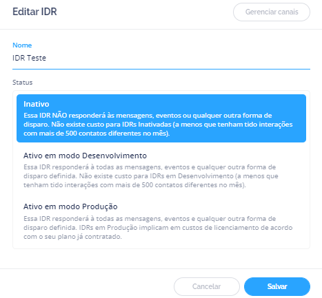 Importante: Para que sua IDR funcione em produção, é necessário que ela tenha ao menos um canal selecionado.