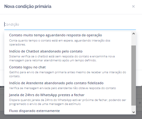 Por exemplo, você pode ter seu fluxo principal embaixo de uma “Mensagem Recebida”, porém adicionar condições para mapeamento de abandono, como “Indício de atendente abandonado”, ou “Contato muito tempo aguardando uma resposta”.