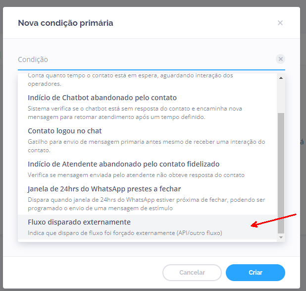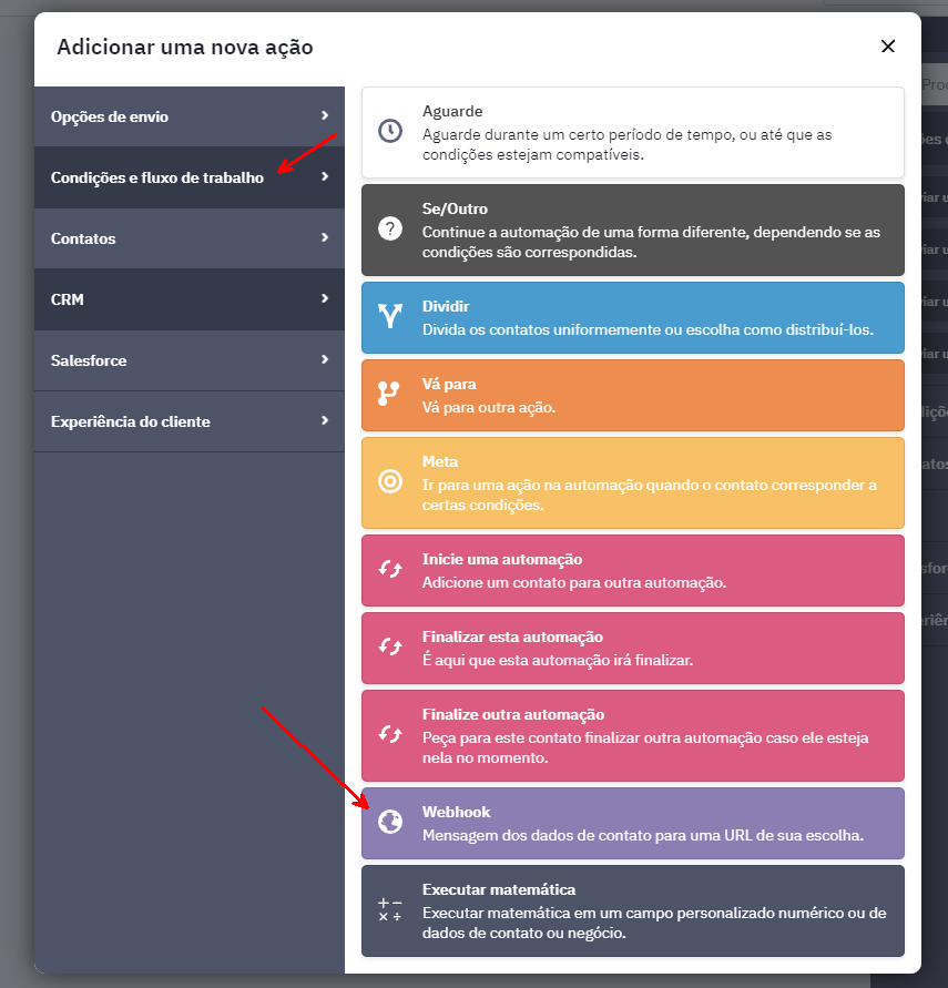 Agora, clique em na opção “Condições e fluxo de trabalho“, na sequência clique em “Webhook“.