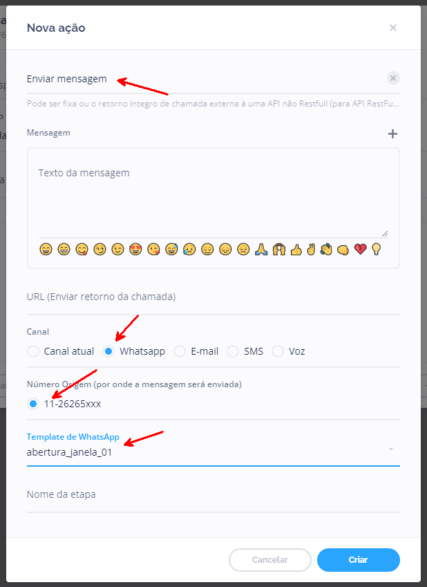 Selecione a ação “Enviar Mensagem“, escolha o canal “WhatsApp“, escolha o número de origem (caso você tenha mais números cadastrados na plataforma) e selecione a Template de WhatsApp desejada. Clique em “Criar“.