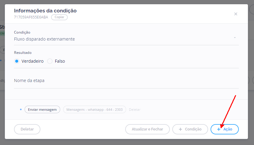 Adicione uma nova ação para enviar a mensagem. Clique em “+ Ação“.
