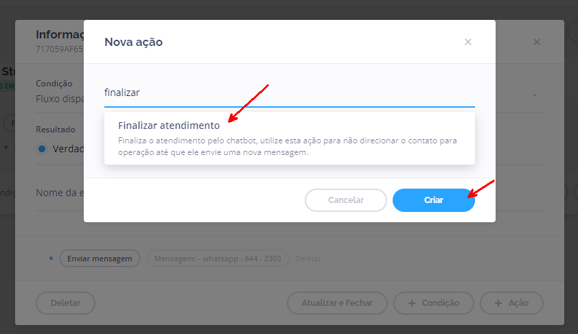 Selecione a ação “Finalizar atendimento” e clique em “Criar”.
