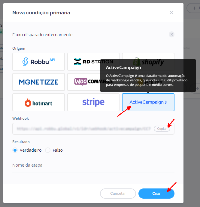 Agora, escolha a integração “ActiveCampaign” e clique no “webhook” para copiar a URL. Após salvar o endereço do seu Webhook, clique em “Criar”.