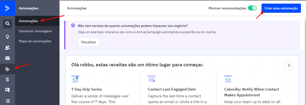 Vá até o painel da ActiveCampaign, localize no menu lateral o ícone Automações e clique no botão “Criar uma automação“, como na imagem: