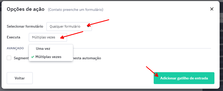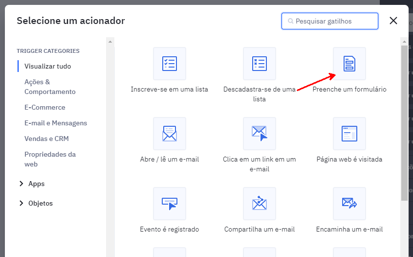 Adicione um gatilho de entrada, neste exemplo iremos usar qualquer formulário, mas você pode escolher outras opções de acordo com a sua estratégia de negocio. Todas elas devem funcionar perfeitamente.