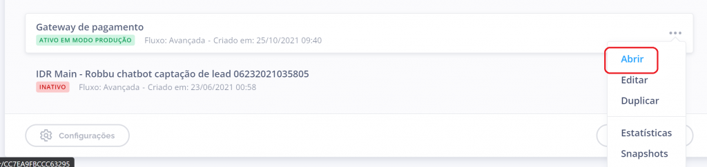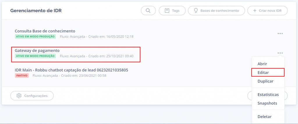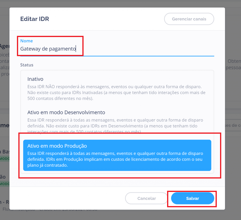 Em “Modo Produção”, informe a URL que acabamos de guardar gerada na condição primária da IDR Chatbot Studio.