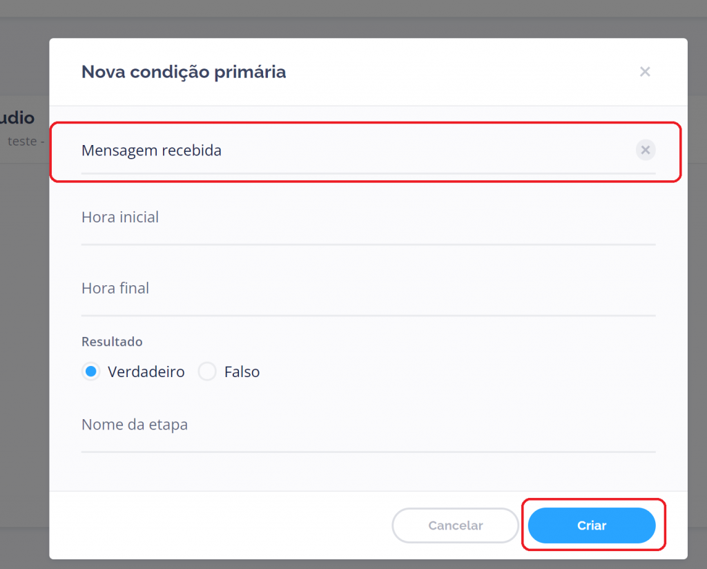 Selecione a opção “Mensagem Recebida” e clique em “Criar”.
