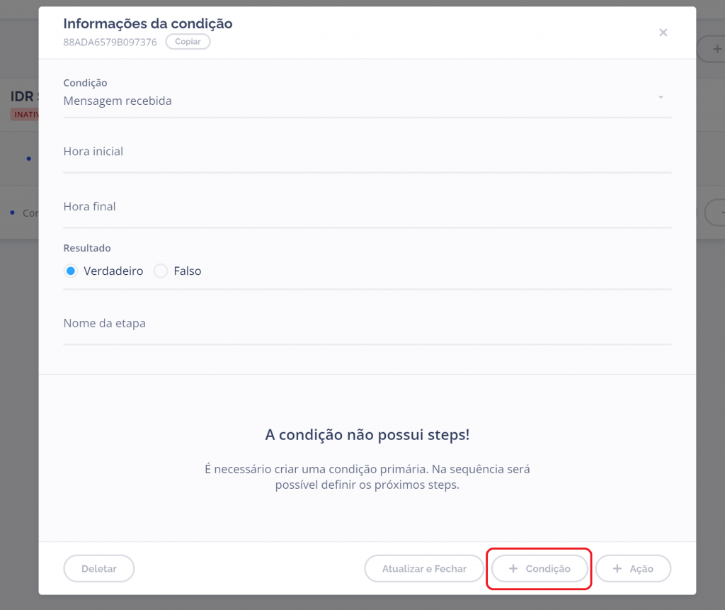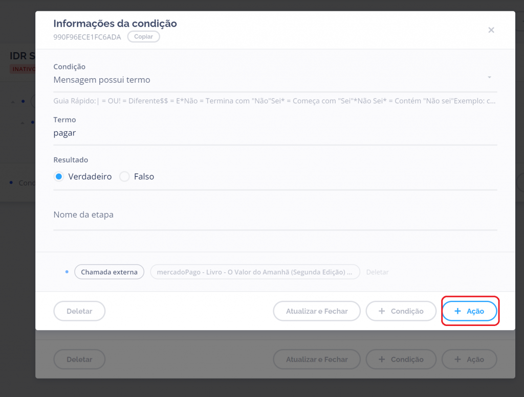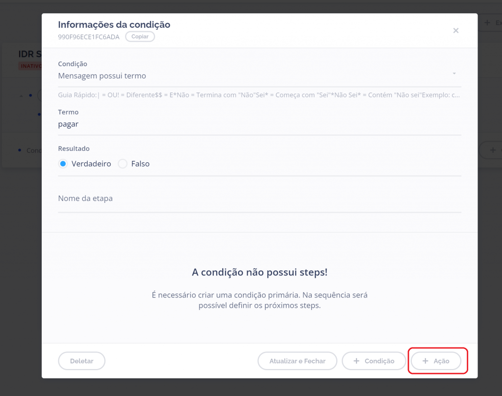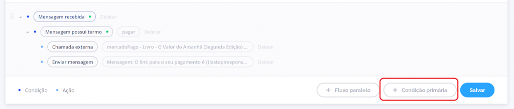 Agora, dentro da condição “pagar” iremos adicionar a ação de enviar o link de pagamento. Clique na condição para abrir a tela de configuração.