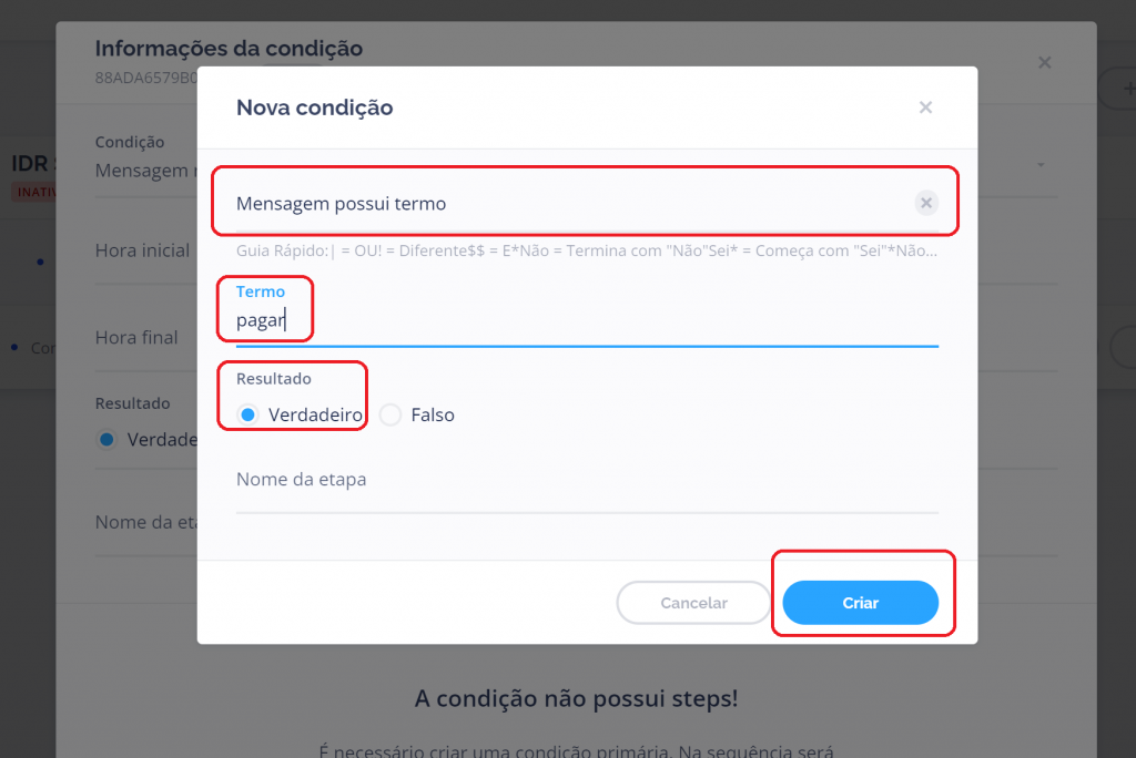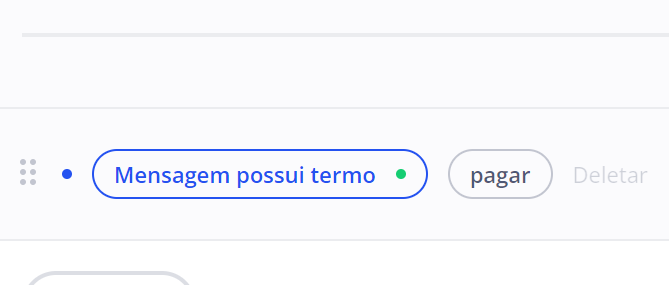 Usaremos a condição “Mensagem possui termo”, defina o termo como “pagar”. Assim, toda vez que receber a mensagem “pagar”, iremos enviar um link de pagamento do Mercado Pago.