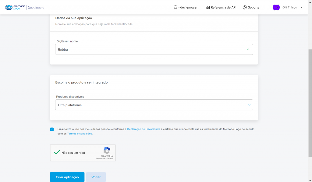 Clique em autorizar o uso dos dados pessoais, valide o Captcha e clique em “Criar aplicação”.