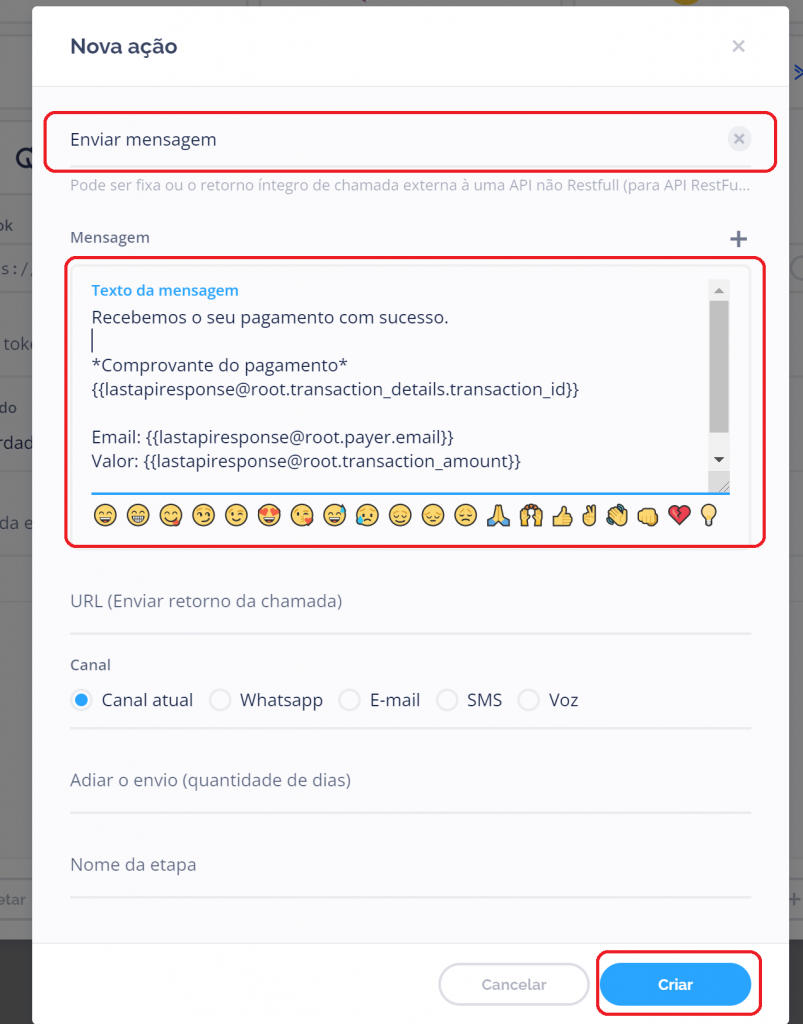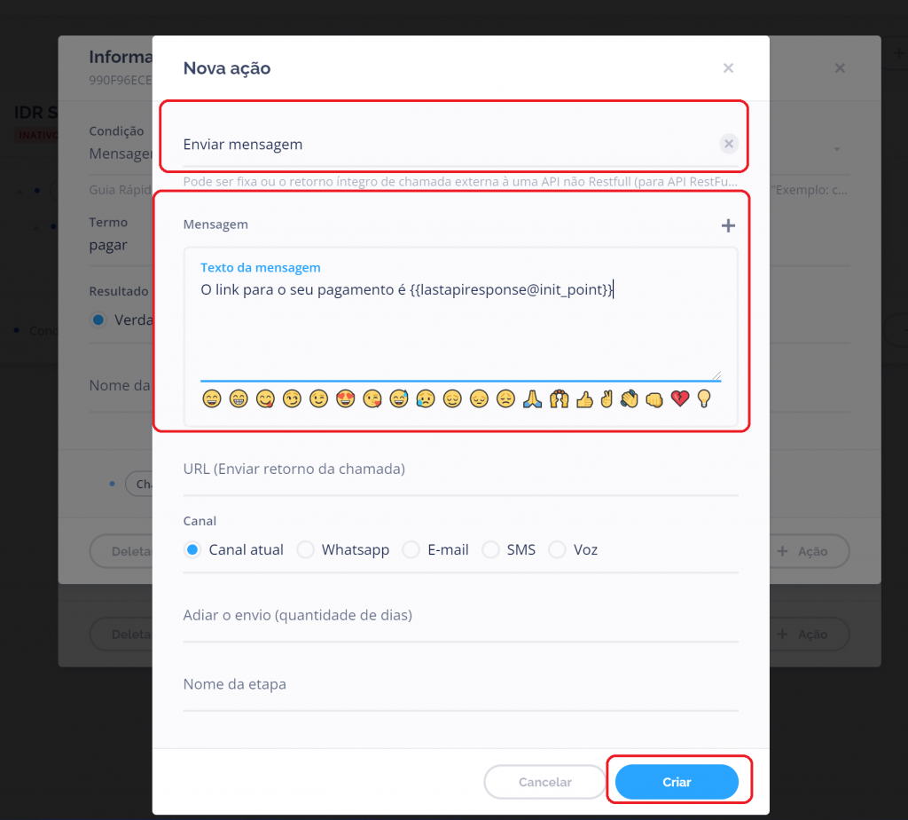 Mensagem: “O link para o seu pagamento é {{lastapiresponse@init_point}}”