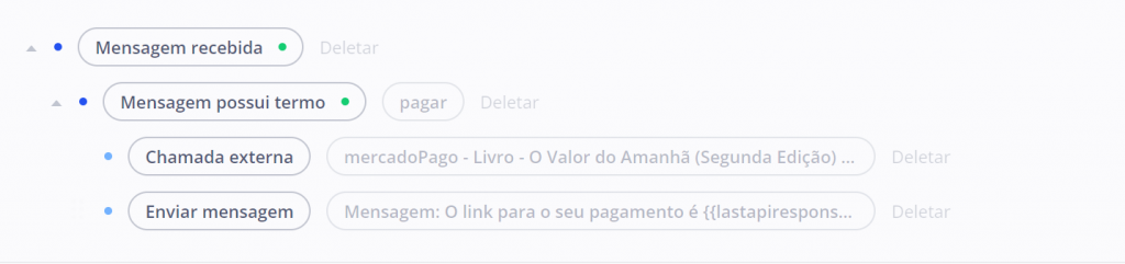 Agora, vamos criar um gatilho, uma palavra-chave para enviar o pagamento. Lembrando que este é um exemplo resumido e, obviamente, você pode construir todo o processo de integração com diversas variáveis e produtos.