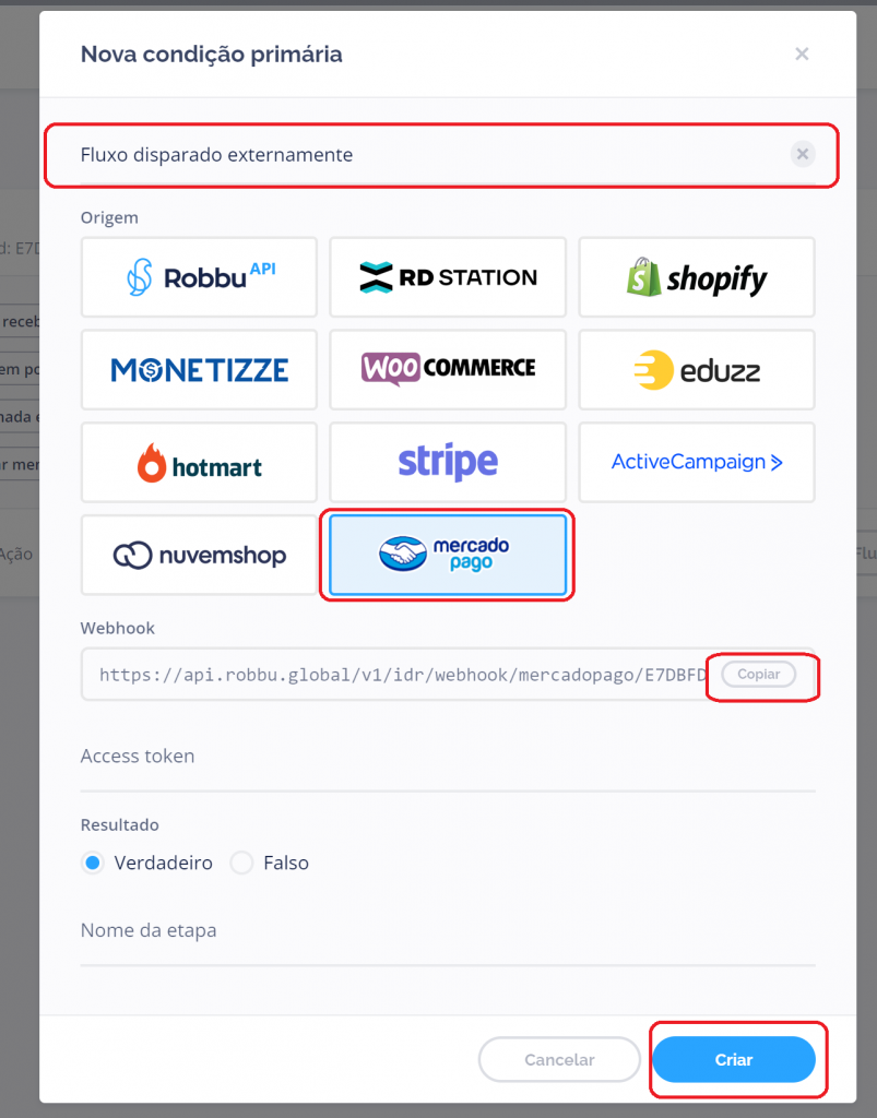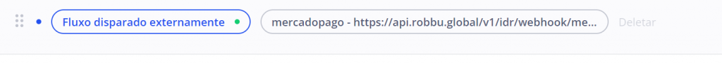 Adicione a condição “Fluxo disparado externamente” e selecione a origem “MercadoPago”.