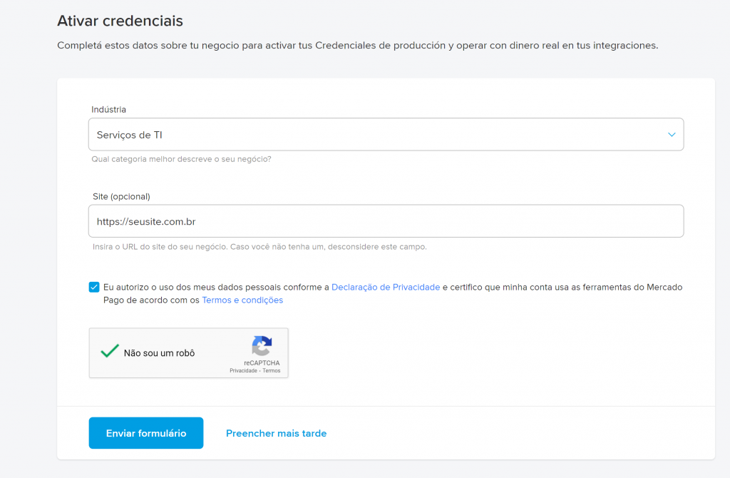 Preencha os dados conforme o seu negócio e clique em “Enviar Formuário”.