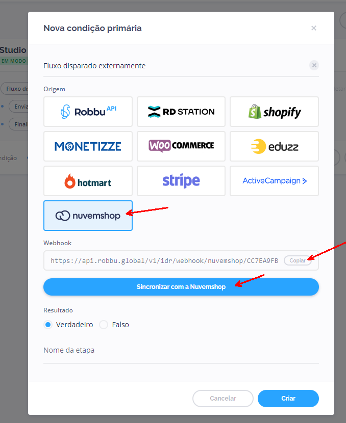 Obs.: É muito importante copiar a URl do seu Webhook, ao abrir a tela de sincronismo com a Nuvemshop você irá utilizar.