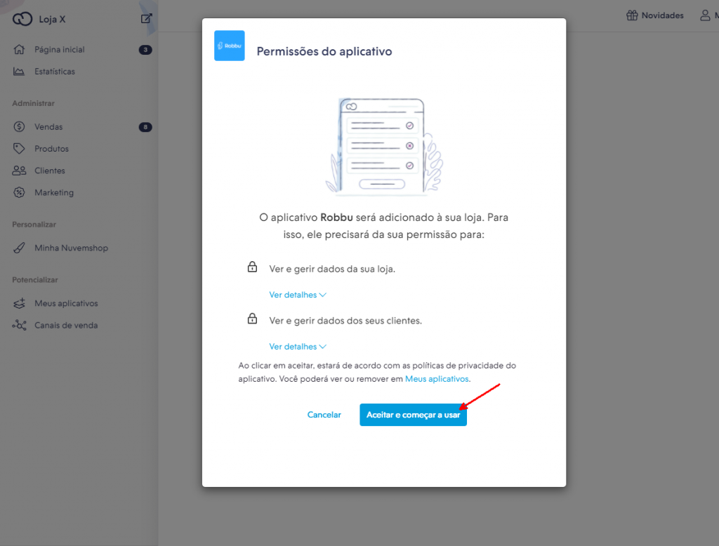 Ao clique no botão “Sincronizar com a Nuvemshop”, você será direcionado para loja da Nuvemshoop conforme imagem abaixo.