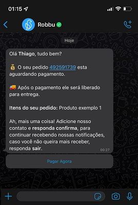 Você pode personalizar as mensagens, veja apenas um exemplo de recebimento de mensagem no WhatsApp: