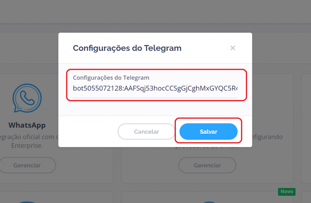 Insira o seu token do Telegram (gerado pelo bot nas etapas acima) e clique em “Salvar”.