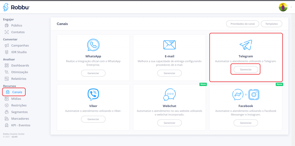 Acesse o portal da Robbu, Invenio Center, navegue no menu “Canal” >> “Telegram” e clique no botão “Gerenciar”.