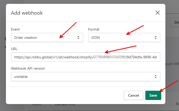Na opção de URL, coloque a URL da integração da Shopify que você copiou da etapa anterior. Lembre-se de manter o formato como json.