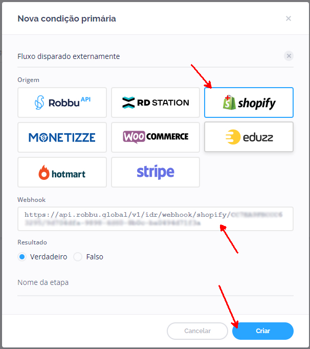 Agora, escolha a integração “Shopify” e clique no “webhook” para copiar a URL. Após salvar o endereço do seu Webhook, clique em “Criar”.