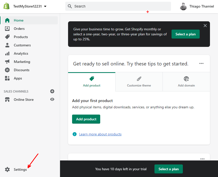 Vá o painel da Shopify e acesse o painel principal e, logo depois, clique na opção Configuração: